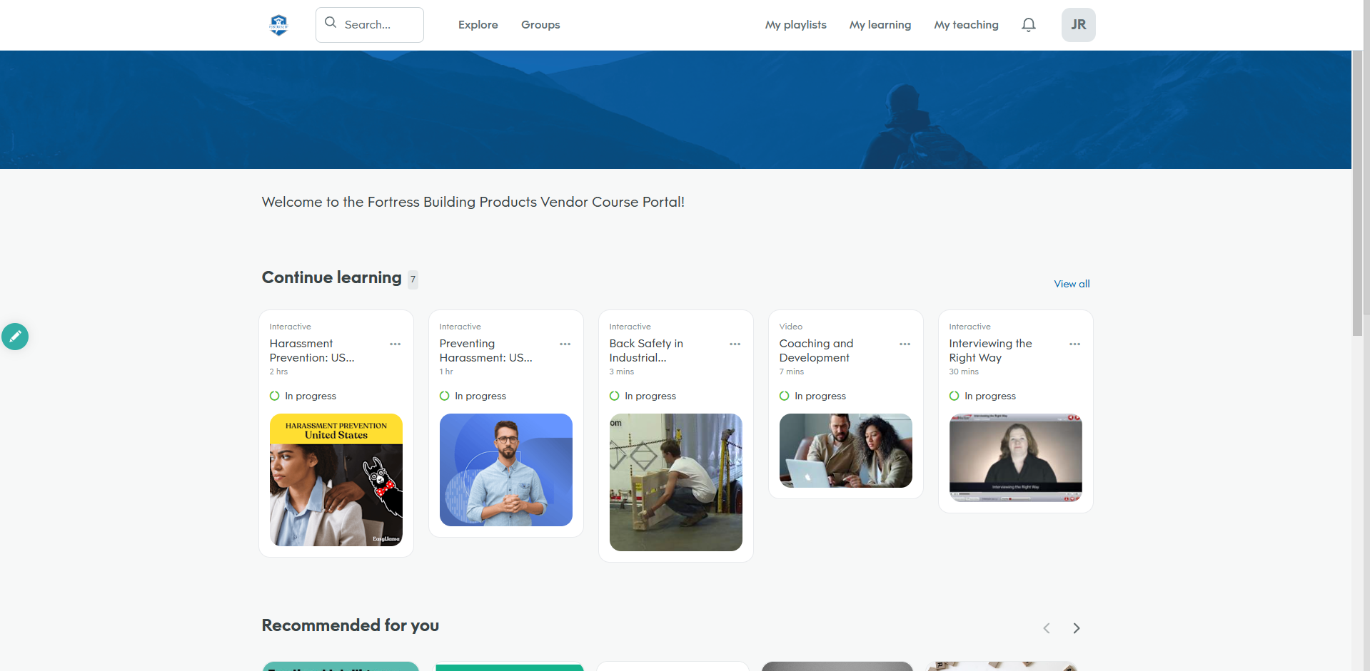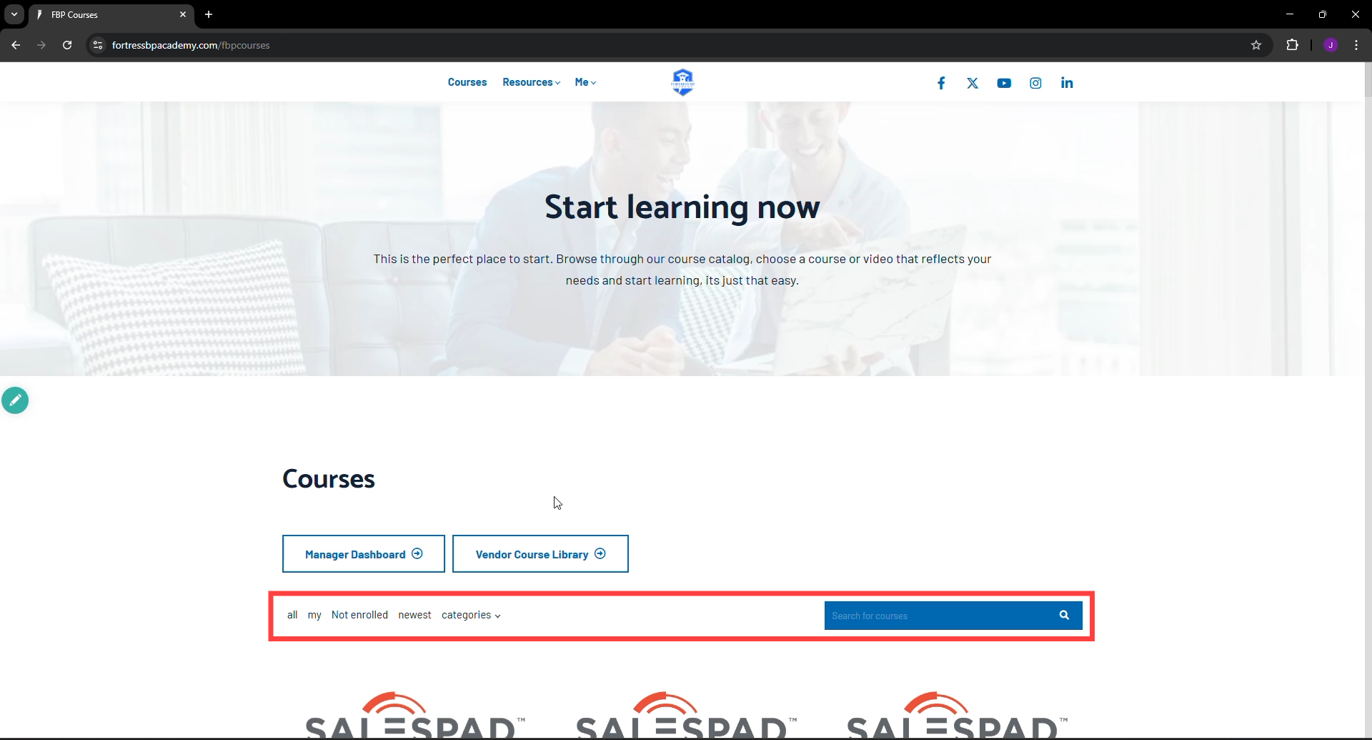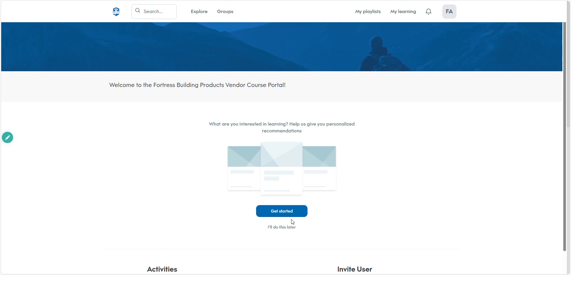 All Learners (except managers) will see this screen upon login. Here you can access various FBP created courses such as those on Product, Salesforce, or Fortify & Engage archived sessions.