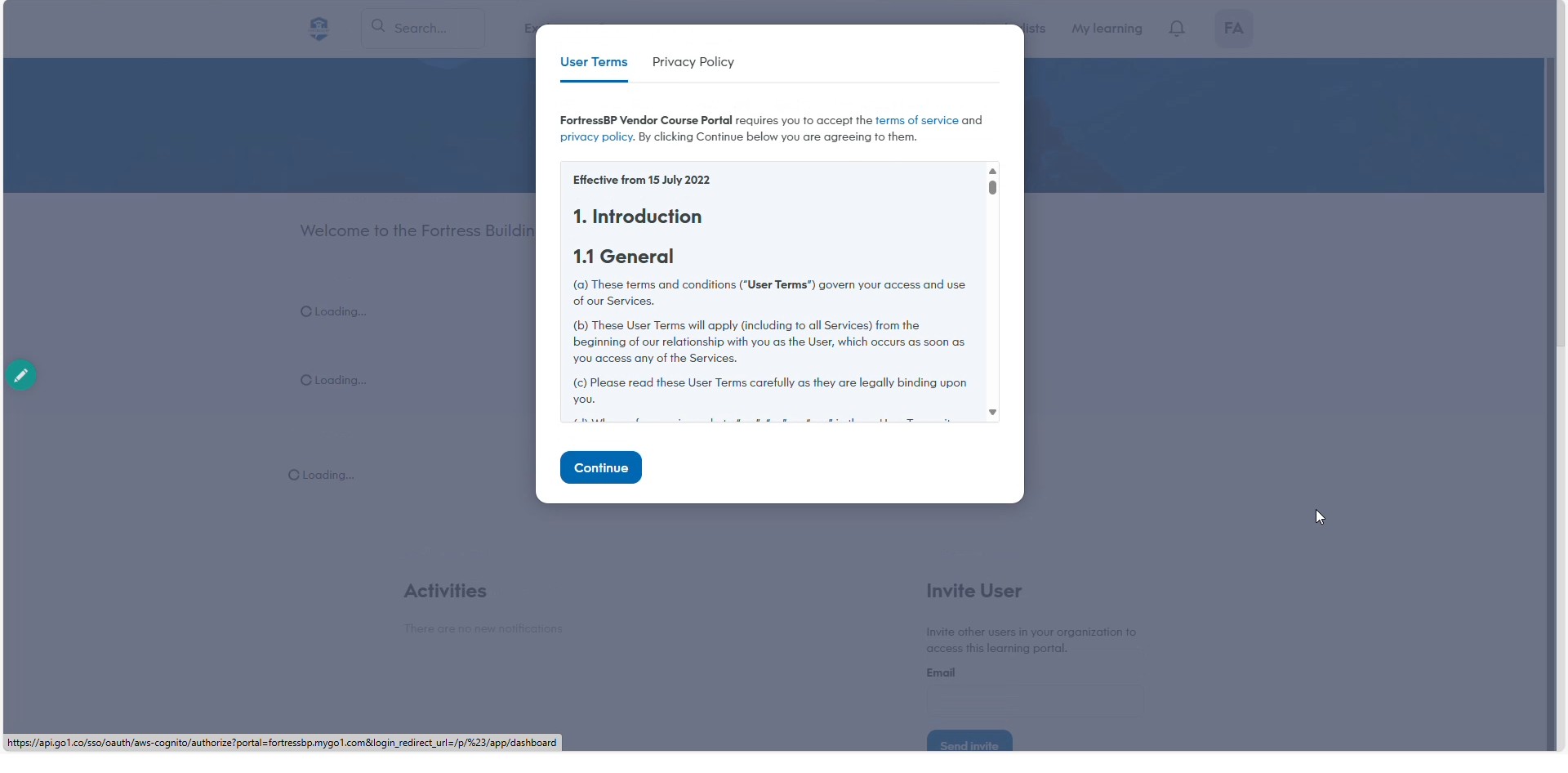 Here you will find all your vendor course related content. The first time you enter the portal there will be a User Terms Agreement, Click Continue to Proceed.